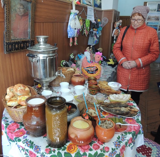 Целый блок островновцы отвели предметам старины. Получился настоящий мини-музей. Но самым примечательным здесь был круглый стол с простой крестьянской едой наших бабушек и дедушек: в кувшинах - молоко, в крынках – сметана, солёные грибы и арбузы, жареные караси, сало, холодец, блины, варенье, булочки в плетёных корзинах. А в центре – красавец самовар.