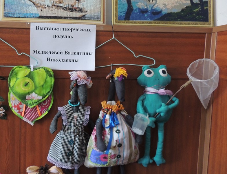 По соседству с керамикой уютно разместилась выставка-продажа поделок Беляевой Марины Сергеевны: оригинальные свечи, гипсовые фигурки, мыльные букеты. Выставка творческих работ Шмидт Тамары Владимировны показала разносторонние таланты этой мастерицы: ажурные мягкие кофты, вязанные крючком салфетки, картины в технике алмазной мозаики от пейзажей, натюрмортов, до святых образов.