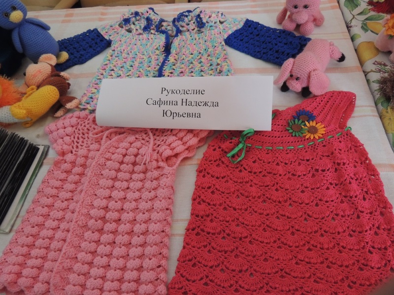 Сафина Надежда Юрьевна продемонстрировала мастерство работы  крючком – от изумительной детской одежды до мягких игрушек. Детский сад «Тополёк» подхватил эстафету игрушек и показал их в совершенно разных техниках. В рукоделии Ершовой Валентины Андреевны хотелось бы выделить лоскутное шитьё, которое требует аккуратности, фантазии, математической точности и терпения. Стильные вязаные изделия Дмитриевой Зинаиды Александровны – шали, рукавицы – согреют любую их обладательницу в морозные зимние дни. А напольные кружки Протасовой Валентины Михайловны напомнили уютные деревенские дома наших бабушек, правда некоторые из них усложнены добавлением современных элементов и похожи на распустившиеся цветы.