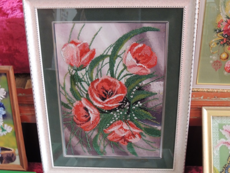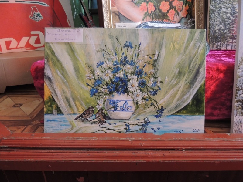 Изделия из берёсты и дерева Решетова Сергея Николаевича отразили русские национальные мотивы – это и туески, и разделочные доски в виде богатырей и матрёшек. Не менее талантливо с деревом работает Шимко Владимир Иванович, а продолжила его творчество на выставке родственница – Галкина Нина Ивановна, которую можно назвать открытием года. Во-первых, очаровали её изящные украшения из бисера, но самое главное – замечательные картины этой самобытной художницы, выполненные в самых разных жанрах – портреты, натюрморты, пейзажи, работы смешанной техники.