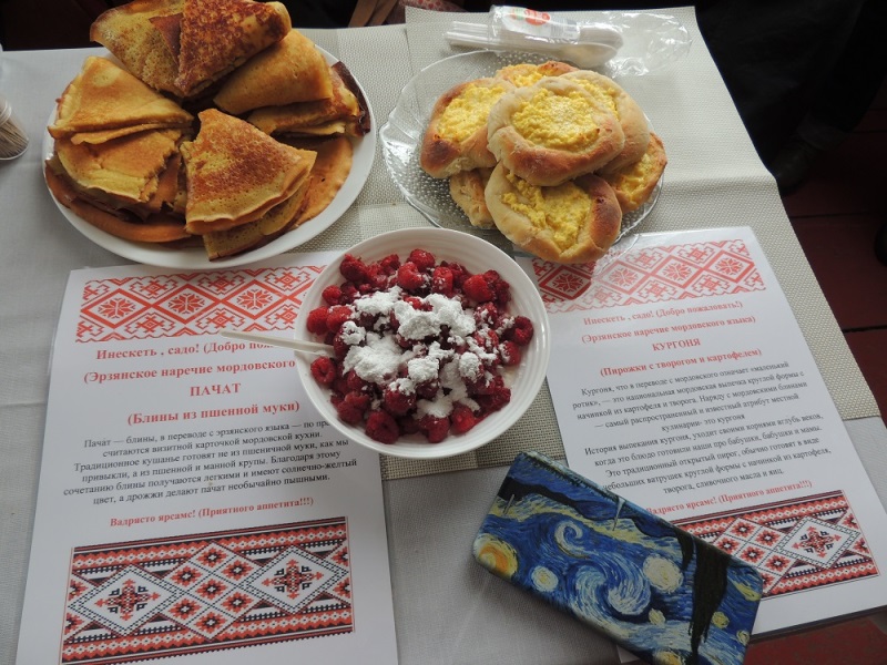 Покровский СДК нас встретил выставкой – «Традиции живая нить». Красиво оформленный русский самовар на фоне ярких шалей плавно переводит зрителей выставки к дегустации национальных блюд. Покровцы представили блюда именно тех национальностей, которые проживают у них в селе – ароматный армянский плов, румяные русские пирожки и блины, традиционный немецкий кухен, аппетитные украинские вареники. Здесь же можно было отведать настоящие татарские баурсак и эчпочмак, а мордовская кухня была представлена блинами из пшеничной муки - пачат и пирожками с творогом и картофелем – кургона. Каждое блюдо сопровождала красиво оформленная информация об истории и традициях той или иной национальной кухни.