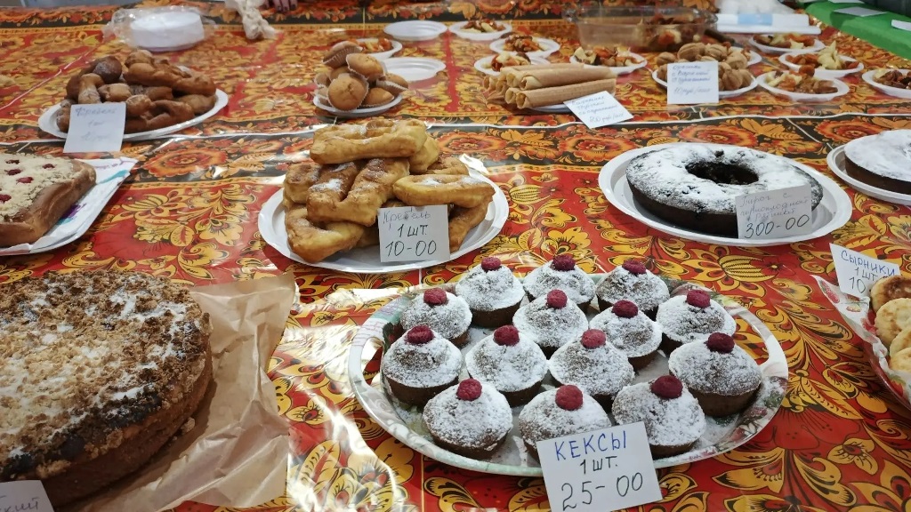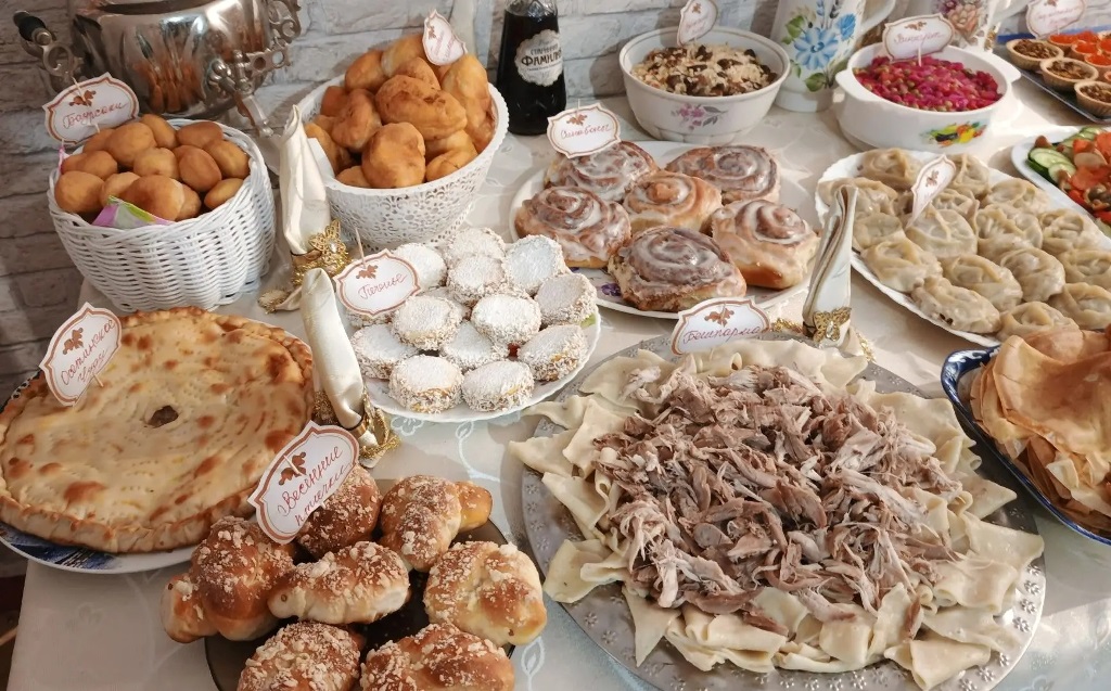 Столы здесь буквально ломились от яств. На подносах соседствовали аппетитные булочки в виде весенних птичек, поджаристый осетинский пирог чуду, румяные баурсаки, политые сладким кремом синнабоны, наваристый бешбармак и сочные манты. Рядом расположились привычный винегрет, рассыпчатый плов, хрустящая самса, домашние котлеты, чак-чак и разнообразные пирожки — всего и не перечесть!