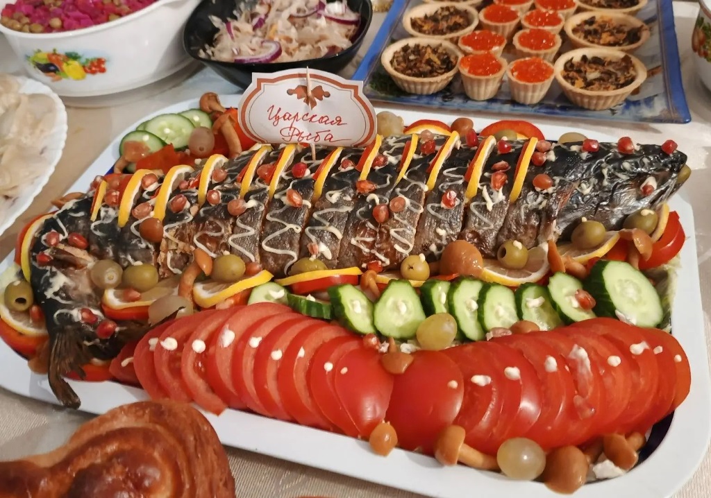 Однако королевой застолья по праву стала «Царская рыба». Украшенная дольками лимона и яркими овощами фаршированная красавица-горбуша выглядела настоящим кулинарным шедевром. И сразу видно — золотые руки хозяек потрудились на славу!