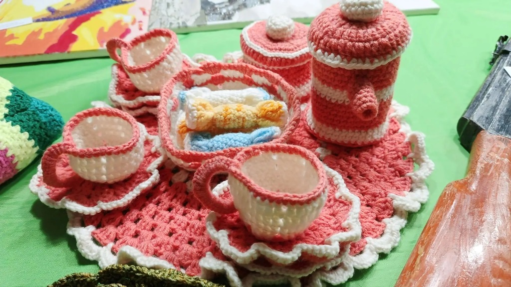 А дальше глаза разбегались от разнообразия: вязаные и сшитые наряды, аксессуары, игрушки и картины, сверкающие грани алмазной мозаики, изящные плетеные шкатулки и корзины.