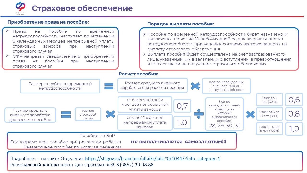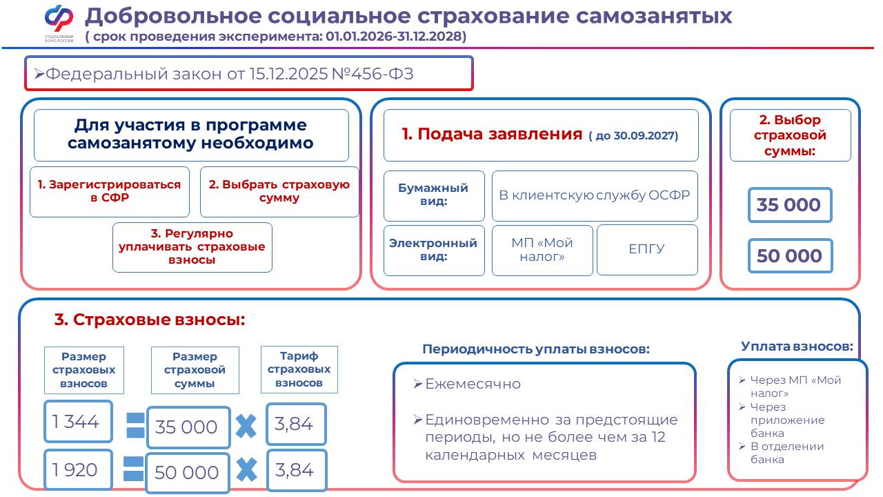 Отделение социального фонда России по Алтайскому краю информирует о том, что с 2026 года стартовал эксперимент по добровольному социальному страхованию «самозанятых». Он позволяет тем, кто уплачивает налог на профессиональный доход, получать выплаты по листкам нетрудоспособности. Пилотный режим продлится до 31.12.2028 г.