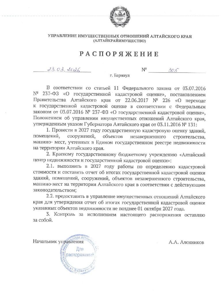 «О государственной кадастровой оценке», во исполнение распоряжения управления имущественных отношений Алтайского края от 23.03.2026 № 305 в 2027 году будет проведена государственная кадастровая оценка зданий, помещений, сооружений, объектов незавершенного строительства, машино-мест, учтенных в Едином государственном реестре недвижимости на территории Алтайского края.