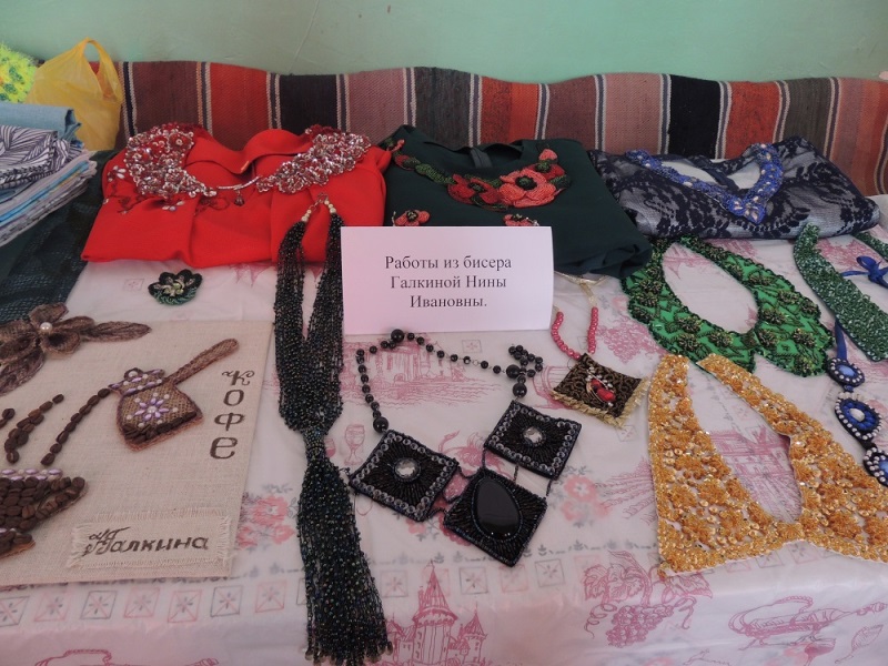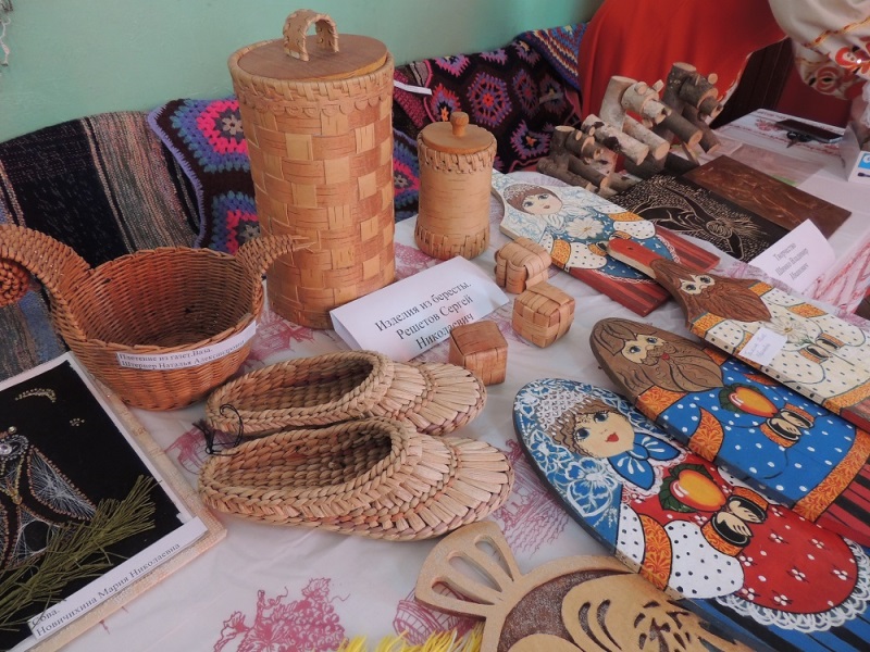 Изделия из берёсты и дерева Решетова Сергея Николаевича отразили русские национальные мотивы – это и туески, и разделочные доски в виде богатырей и матрёшек. Не менее талантливо с деревом работает Шимко Владимир Иванович, а продолжила его творчество на выставке родственница – Галкина Нина Ивановна, которую можно назвать открытием года. Во-первых, очаровали её изящные украшения из бисера, но самое главное – замечательные картины этой самобытной художницы, выполненные в самых разных жанрах – портреты, натюрморты, пейзажи, работы смешанной техники.