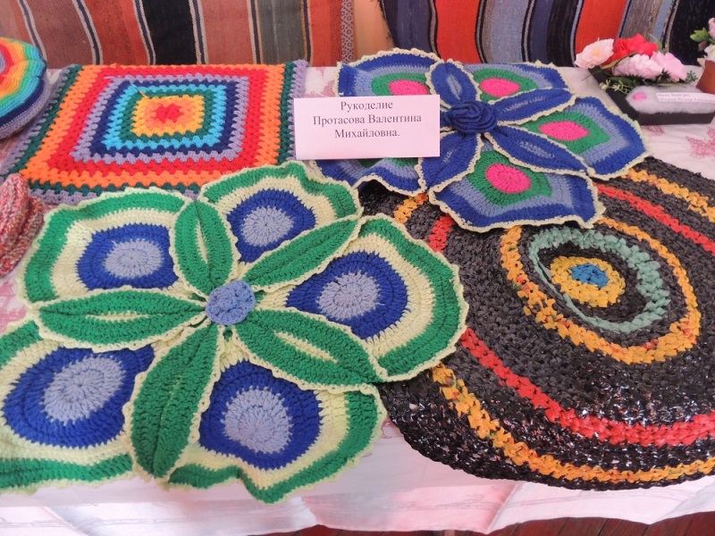 Сафина Надежда Юрьевна продемонстрировала мастерство работы  крючком – от изумительной детской одежды до мягких игрушек. Детский сад «Тополёк» подхватил эстафету игрушек и показал их в совершенно разных техниках. В рукоделии Ершовой Валентины Андреевны хотелось бы выделить лоскутное шитьё, которое требует аккуратности, фантазии, математической точности и терпения. Стильные вязаные изделия Дмитриевой Зинаиды Александровны – шали, рукавицы – согреют любую их обладательницу в морозные зимние дни. А напольные кружки Протасовой Валентины Михайловны напомнили уютные деревенские дома наших бабушек, правда некоторые из них усложнены добавлением современных элементов и похожи на распустившиеся цветы.