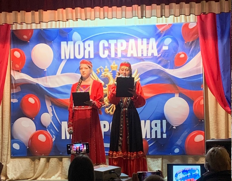 Ведущие Чурбакова Дарина, Зайкова Елена Михайловна, Судакова Елизавета и Маркелова Эвелина задали торжественный тон празднику, пригласив всех в путешествие по страницам истории и культуры нашей Родины.