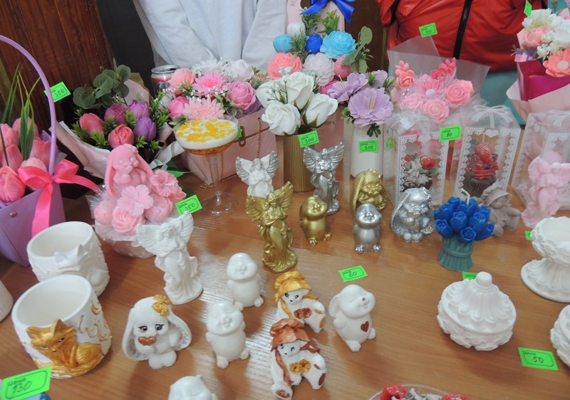 По соседству с керамикой уютно разместилась выставка-продажа поделок Беляевой Марины Сергеевны: оригинальные свечи, гипсовые фигурки, мыльные букеты. Выставка творческих работ Шмидт Тамары Владимировны показала разносторонние таланты этой мастерицы: ажурные мягкие кофты, вязанные крючком салфетки, картины в технике алмазной мозаики от пейзажей, натюрмортов, до святых образов.