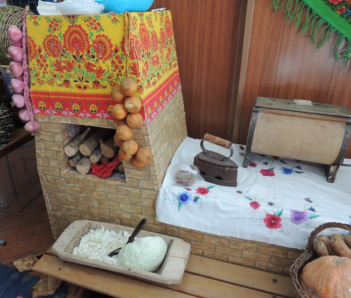 Целый блок островновцы отвели предметам старины. Получился настоящий мини-музей. Но самым примечательным здесь был круглый стол с простой крестьянской едой наших бабушек и дедушек: в кувшинах - молоко, в крынках – сметана, солёные грибы и арбузы, жареные караси, сало, холодец, блины, варенье, булочки в плетёных корзинах. А в центре – красавец самовар.