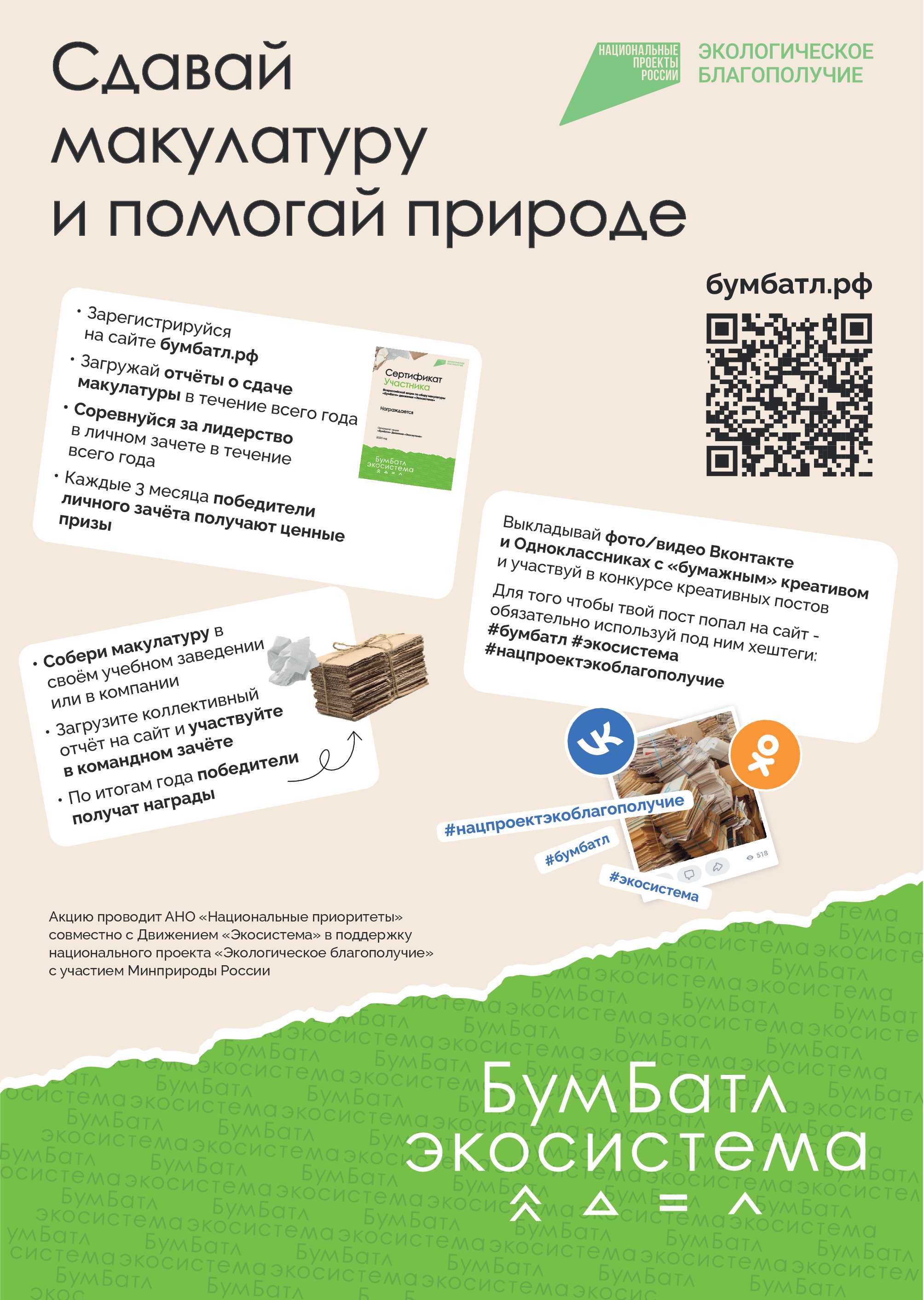 «БумБатл» — это Всероссийская акция по сбору макулатуры в поддержку национального проекта «Экологическое благополучие», который реализуется по решению Президента. Акция проходит под эгидой Всероссийского экологического общественного движения «Экосистема». «БумБатл» дает возможность проявить заботу о природе через сбор и сортировку бумаги. Но, как и любой батл, — это еще и соревнование по количеству собранной макулатуры, где можно побороться за первенство в командном или индивидуальном зачете, а также помочь своему региону стать лучшим по итогам года.