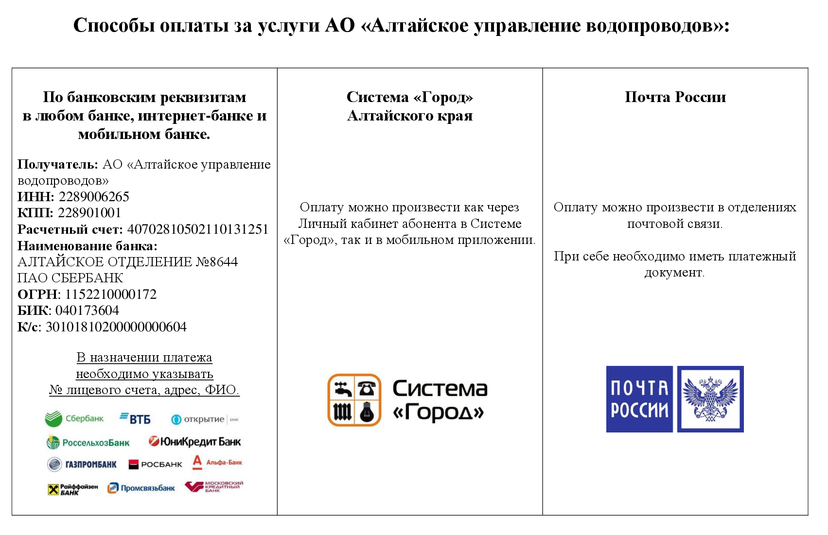 АО «Алтайское управление водопроводов» информирует: Памятка абонентам для оплаты за водоснабжение.