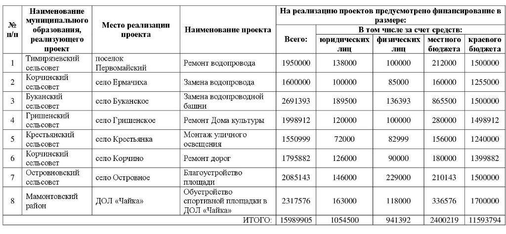 От Мамонтовского района на участие в конкурсном отборе было подано 8 заявок. Все 8 заявок вошли в число победителей, а это означает, что в 2026 году в Мамонтовском районе будет реализовано 8 проектов по благоустройству села на общую сумму 16 млн.рублей.: