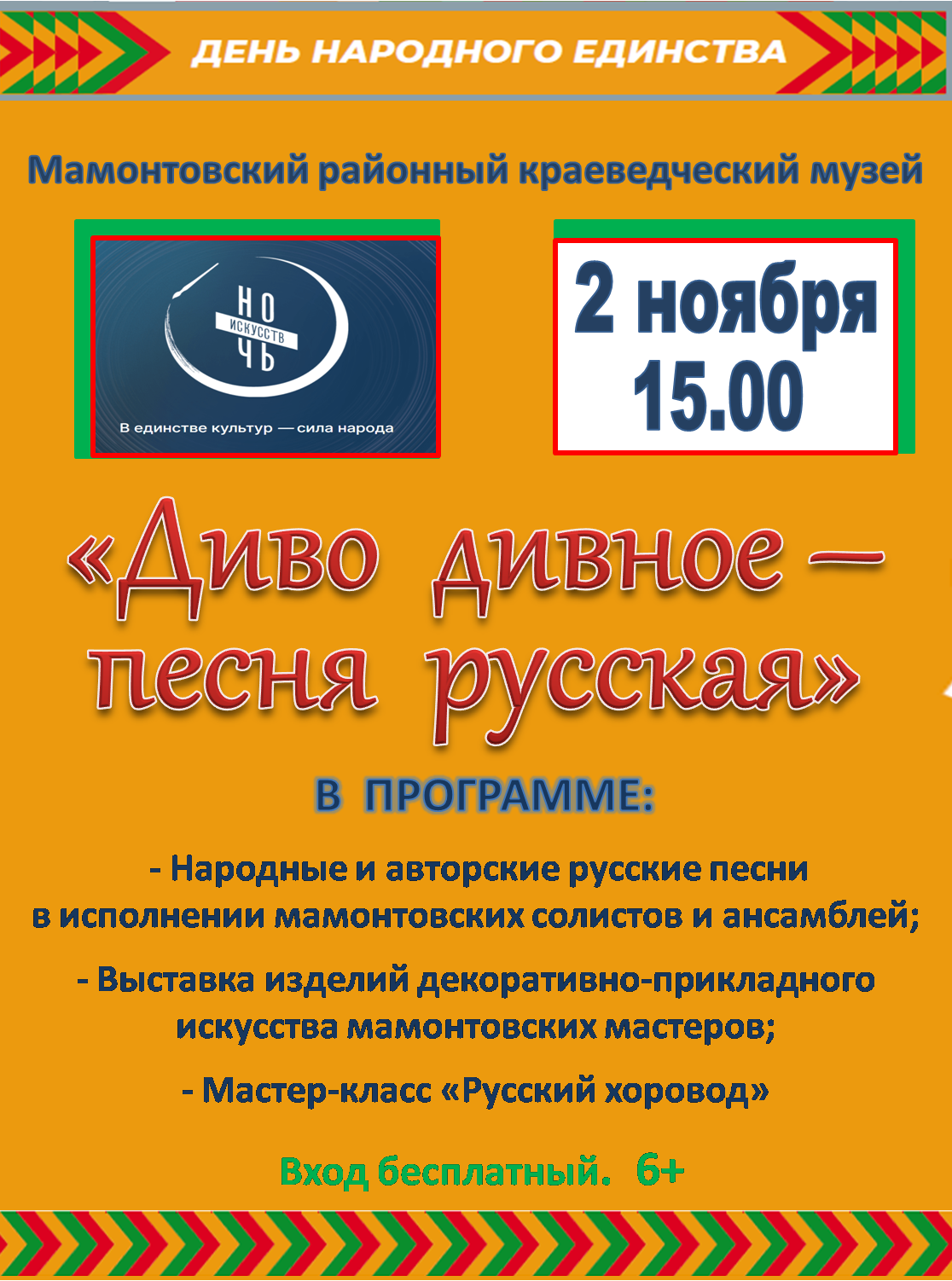 Кроме того, в программе «Ночи искусств» народные и авторские русские песни в исполнении мамонтовских солистов и ансамблей, выставка изделий декоративно-прикладного искусства мамонтовских мастеров, мастер-класс «Русский хоровод». Все это позволит каждому почувствовать себя частью культурного пространства страны.