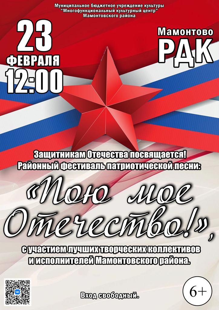 23 февраля в 12 часов в районном доме культуры состоится фестиваль патриотической песни «Пою мое Отечество!».
